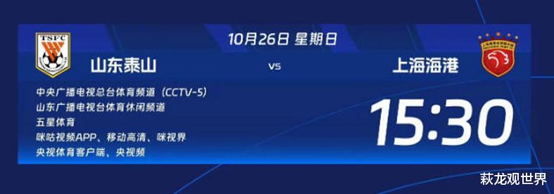 北京时间10月26日下午15:30,中超联赛第28轮将迎来一场强强对话,山东泰山坐镇主场迎战上海海港。央视体育频道CCTV-5、山东广播电视台体育休闲频道、五星体育将进行现场直播,球迷也可通过咪咕视频APP、移动高清、咪视界、央视体育客户端、央视频等网络平台观赛。