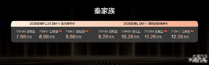 1月8日,比亚迪秦家族迎来重磅加推,2026款秦L DM-i /2026款秦PLUS DM-i 210KM长续航版双车同步上市,售价8.98-12.28万元。其中,2026款秦L DM-i 210KM长续航版限时超级优享价11.28-12.28万元,2026款秦PLUS DM-i 210KM长续航版售价8.98-9.98万元。同时,两款车型均带来了丰厚的上市权益礼。