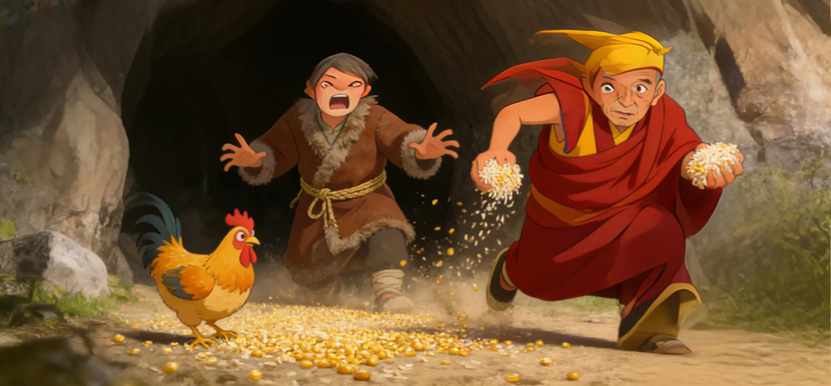 “叫它吃去嘛!那不是鸡儿,是金子,人、碾子,全是金子的。”喇嘛抓的一把米,已成了金豆豆子,羊把式两手空空儿的。