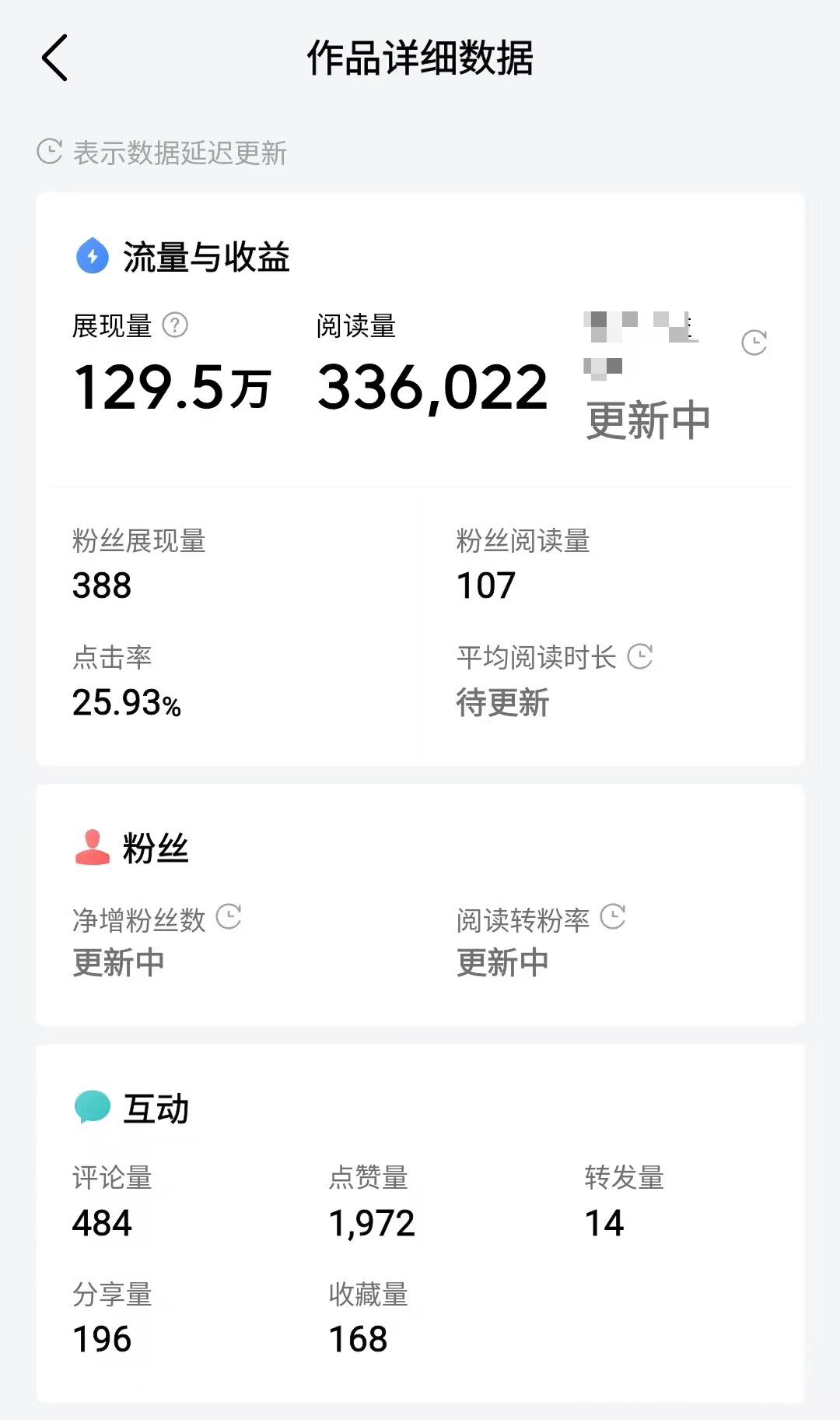 截止到2025年10月29日,这篇自媒体文章的数据,展示量129.5万,阅读量336022,