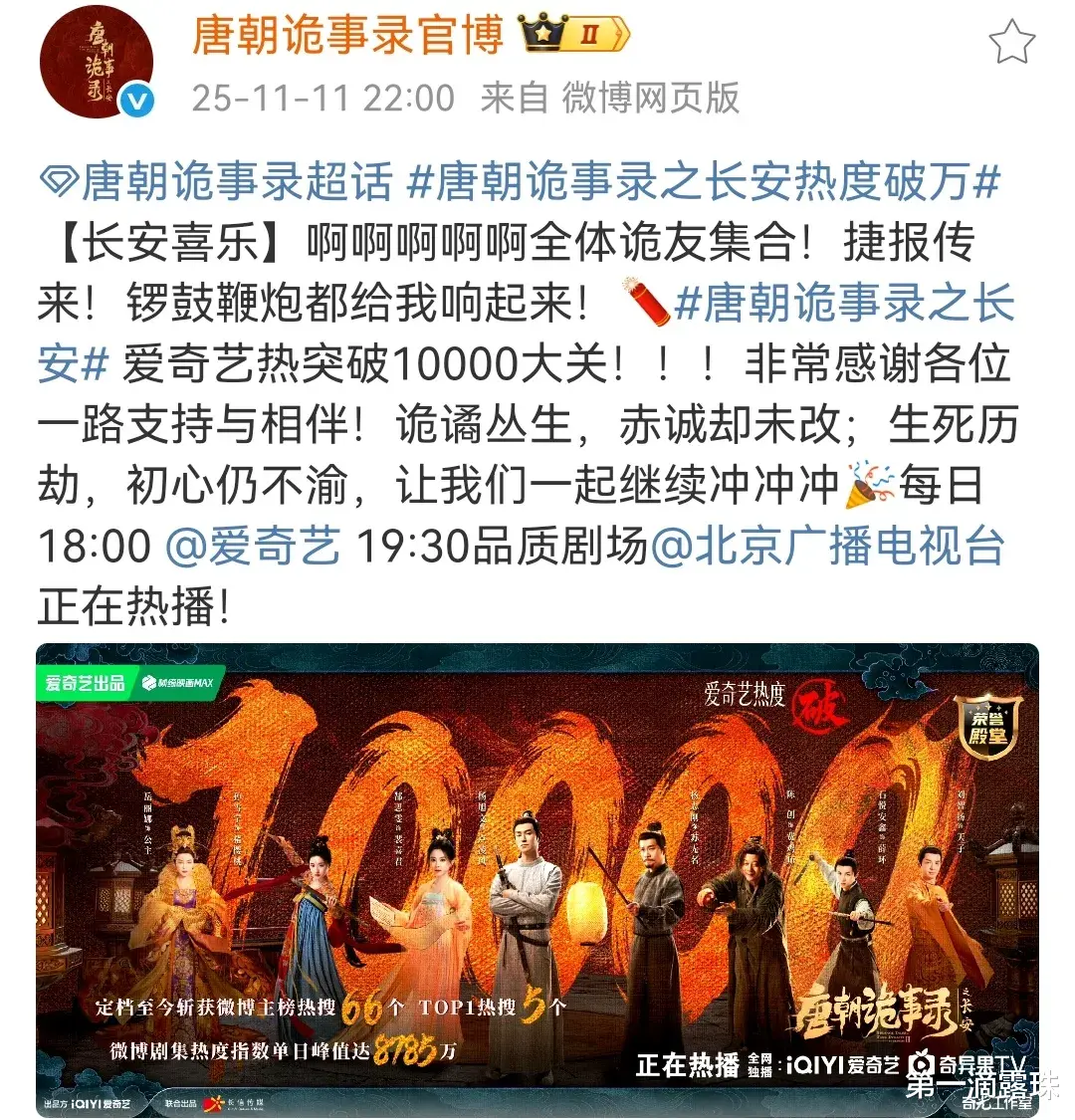 《唐朝诡事录之长安》(《唐诡3》)才开播4天,播到第12集,在爱奇艺站内的热度值就破万了,成为爱奇艺2025年第五部破万剧集,更是打破平台古装探案剧最快破万纪录,速度反超第二季(第二季快收官时才破万)。