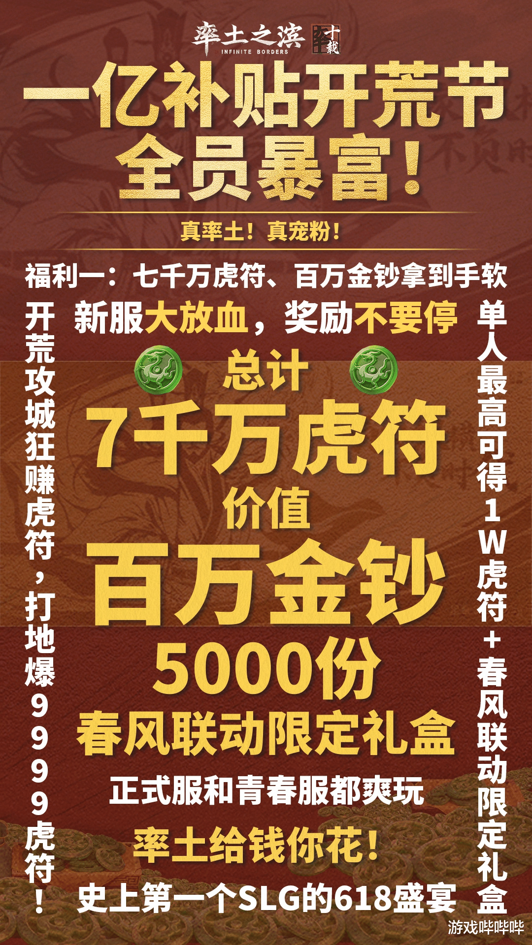结果仔细一扒,好家伙,早在6月1号,官方就在公众号上高调宣布,将在6月5日至7月20日期间开启“一亿补贴开荒节,全员暴富”,送出实打实的1000万虎符、共计价值百万的率土纪念金钞、5000 份春风联动限定礼盒。