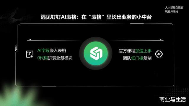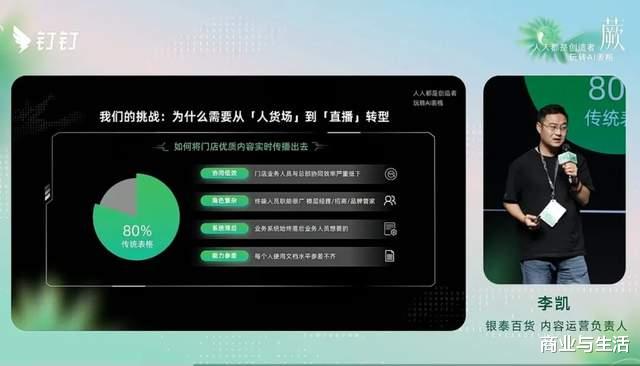 “钉钉AI表格,相当于一个小的ERP系统。你可以总结为,AI表格助力我一个人就成为一家MCN公司。”银泰百货内容运营负责人李凯说。