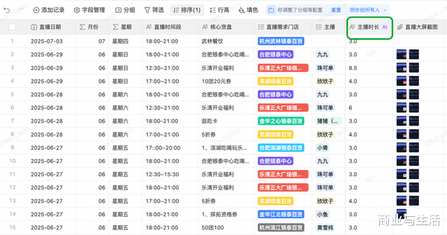 直播前,李凯会通过钉钉AI表格,对主播进行排期,告诉对方,系统会自动将时间、地点、货盘信息推送给对应主播和商场。如果是新主播还会提前进行基础培训,比如展示一些之前主播的切片素材。直播结束后,他会要求主播将自己的一些运营数据,比如直播中的大屏截图等,贴到AI表格中。