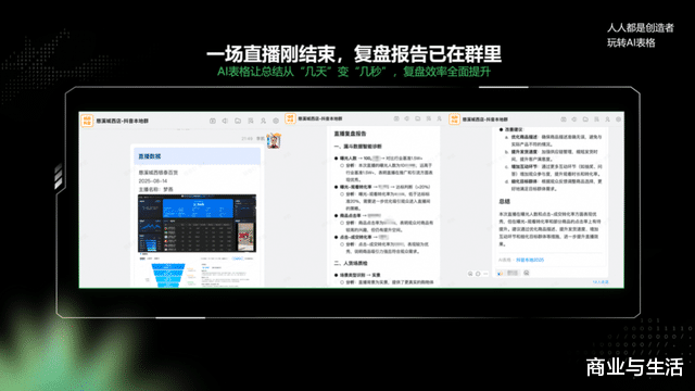 “以前我们做完一场直播,可能过了十几天,我们才能把复盘的数据分享给各个商场,甚至压根都没有时间去做复盘。商场在找我们的时候,我们的反馈也是非常延迟的。自从我们用上AI表格后,这些数据都是实时更新和推送的。有时候,他们都非常吃惊,我怎么晚上12点还在给他们做复盘,其实都是系统AI用我个人的名义发到群里的。”李凯说,因为AI表格半夜总在自动分析、推送数据,内部很多人都叫他“卷王”。“这个数据催着你去干活,这其实是AI表格的核心价值。”
