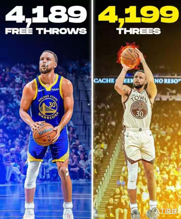 库里作为小球时代的开创者,和汤普森一起被称作水花兄弟,俩人联手拿到多个总冠军奖杯,靠的就是一手出神入化的三分球和无球跑动能力。库里目前在3分球数量和质量上已经成为了绝对的历史第一人,但3分球命中数比总罚球数还高,依旧是出乎了很多人的意料,库里也是突破能力很强的后卫且罚球数很准,却只有4000左右的罚球。