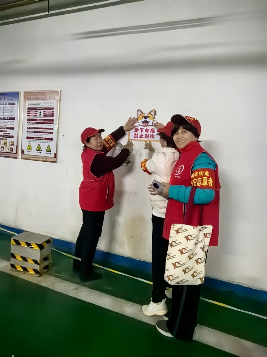 志愿者们到社区地下停车场,对个别居民在地库遛狗带来的环境卫生与交通安全问题,展开了重点宣传,守护地下空间,消除安全隐患。经验丰富的老年志愿者们仔细勘察,在车库主干道的立柱、墙面等醒目位置,亲手粘贴上一张张设计醒目的“地下车库,请勿遛狗”的温馨提示牌。他们一边粘贴,一边向路过居民耐心解释地库遛狗存在的视野盲区、车辆刮擦等风险,劝导大家前往地面指定区域活动。