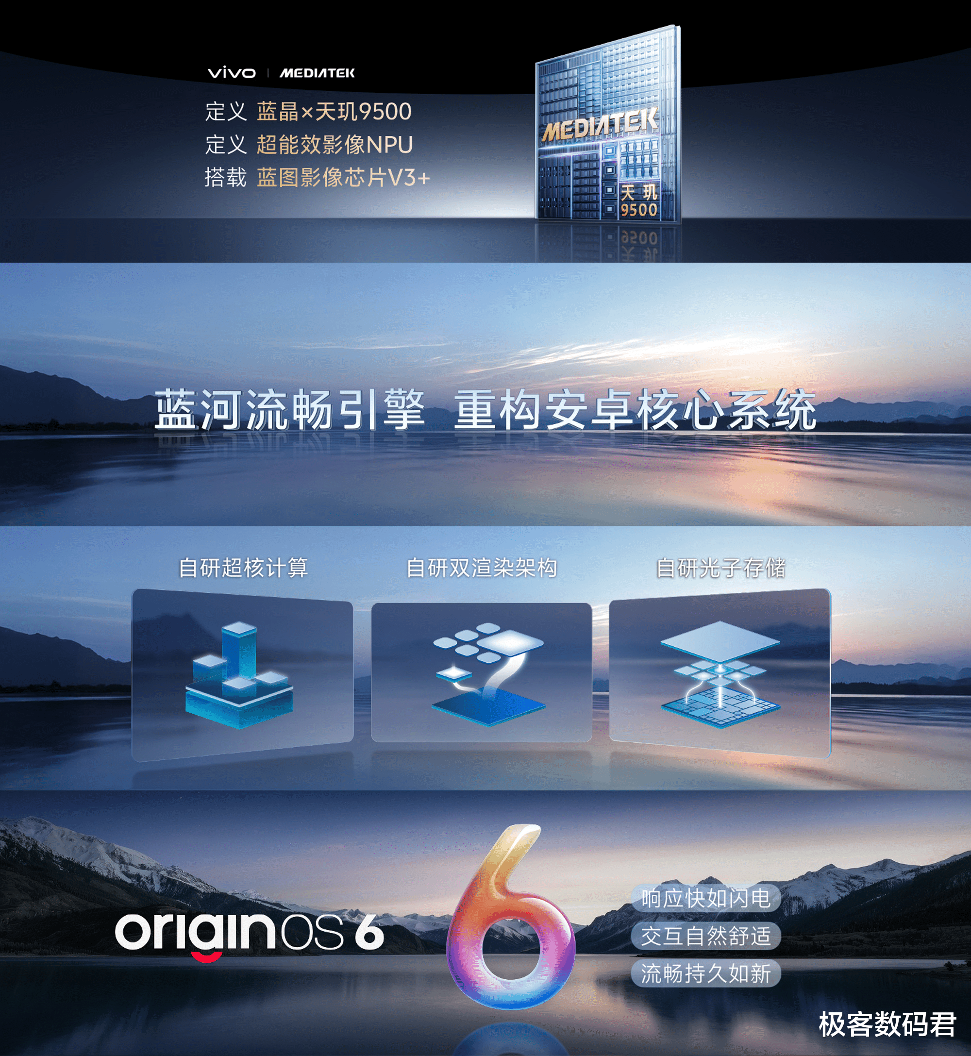 该系列新机在影像领域可以再次引领拍摄体验,成片效果更加专业化,特别是夜景拍摄以及人像拍摄。自研影像芯片V3+带来更为先进的实时计算影像,2亿像素主摄、诸多优秀自研算法的加入也进一步升级了新机的影像能力。硬件配置方面,该系列新机搭载联发科最新旗舰处理器天玑9500,既可以轻松应对高负载的主流手游,带来畅爽游戏体验,也可以配合全新升级的OriginOS 6系统,通过其卓越的软硬件协同,带来更加流畅的用机体验。