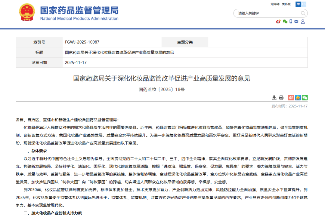 近日,国家药监局正式发布《关于深化化妆品监管改革促进产业高质量发展的意见》,这一备受行业期待的重磅文件,从原料创新、功效申报、注册备案、生产经营监管及国际化发展等多个维度提出24项具体改革措施,旨在全面提升化妆品质量安全水平,推动中国从“制妆大国”向“制妆强国”迈进。