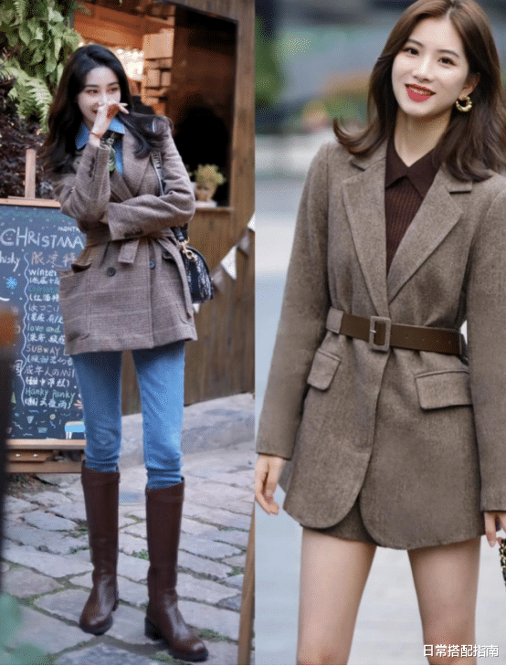 西装外套也有西装裙的基础设计了,就是延续西装的版型,但是把长度加到大腿处,然后再采用系带和双排扣的设计,打造出利落的西装短裙的样式,这种外套在风格上比较显身形,而且因为短款,所以很适合搭配高筒靴,这样穿起来就比常规的西装外套更加洋气。