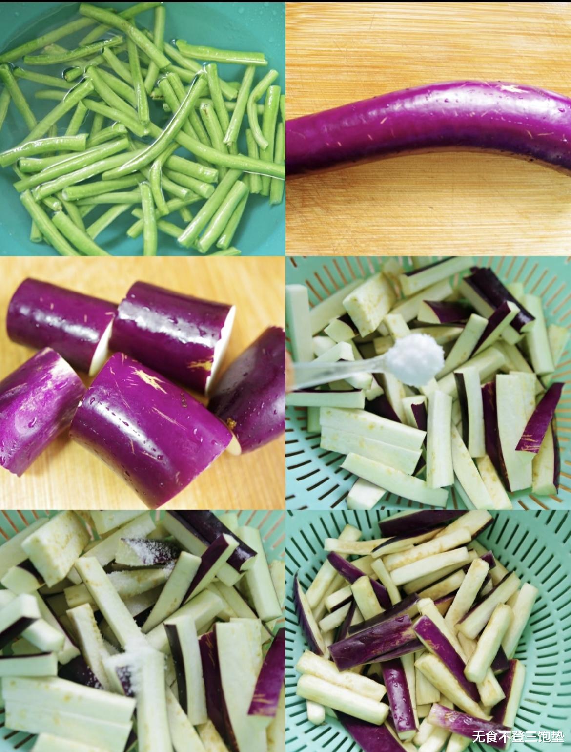 接下来是处理食材的核心技巧。豆角一定要先焯水!水开后加一勺盐和几滴油,把豆角放进去焯烫2分钟,捞出过凉水沥干。这样不仅能去除豆角的生涩味,还能保持它翠绿的颜色,而且更安全,避免没炒熟导致的中毒风险。茄子则要用“杀水法”处理——捞出沥干水分后,撒上一勺盐抓匀,静置10分钟,把腌出的黑水挤掉。这一步能让茄子少吸油,炒出来不腻口,口感更紧实。