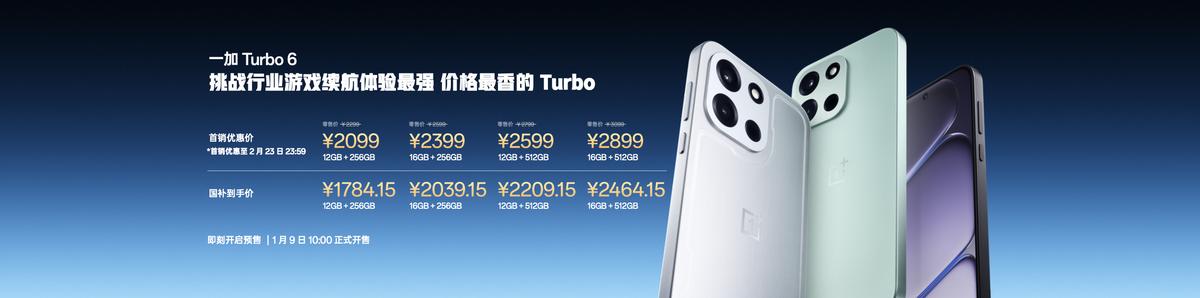 一加 Turbo 6 将于1月9日10:00全渠道正式开售,首销优惠价2099元起,国补到手价1784.15元起;一加 Turbo 6V 将于1月9日10:00全渠道正式开售,首销优惠价1699元起,国补到手价1444.15元起。