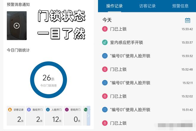 有陌生人敲门时也不再心惊肉跳了,室内的屏幕会自动亮起显示门外来人。而且门锁状态会实时显示在手机上,开了几次门、什么时候开的,我都心中有数。