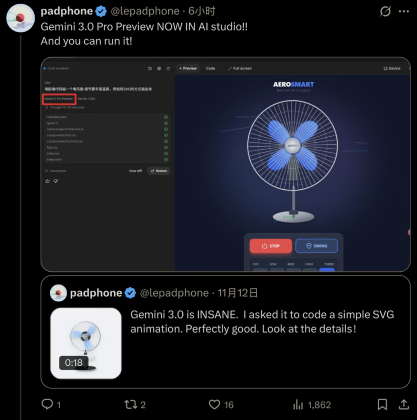 从今天起,Gemini 3 Pro 已在全球范围内向 Gemini App 和 Google AI Studio 用户推送。甚至在正式官宣之前,谷歌已经悄悄把模型提前上线。