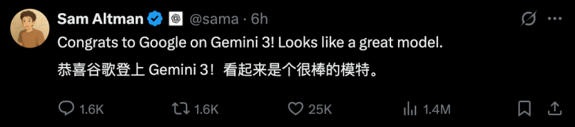 作为谷歌迄今最强的一代基础模型,Gemini 3 在推理、多模态、工具使用等核心维度上全面超越了 2.5 和 2.0 系列,也被谷歌内部定义为一次“代际升级”。就连奥特曼在看到相关案例展示时,都忍不住点了赞。