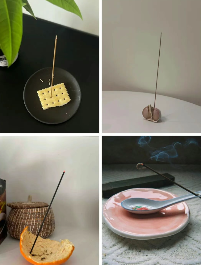 插线香要有底座,但是如果底座找不到了,也不要着急,因为家里有很多东西都可以变成线香的底座,比如饼干片,比如大蒜,比如橘子皮,比如勺子把。