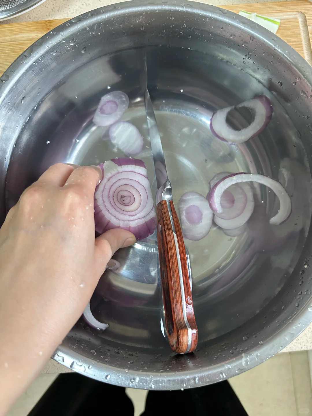切洋葱的时候,洋葱产生的辣味素会辣眼睛。每次切洋葱都是泪流满面的,如果你不想切洋葱的时候流眼泪,其实还有一个小技巧,可以将洋葱放在水里面切,