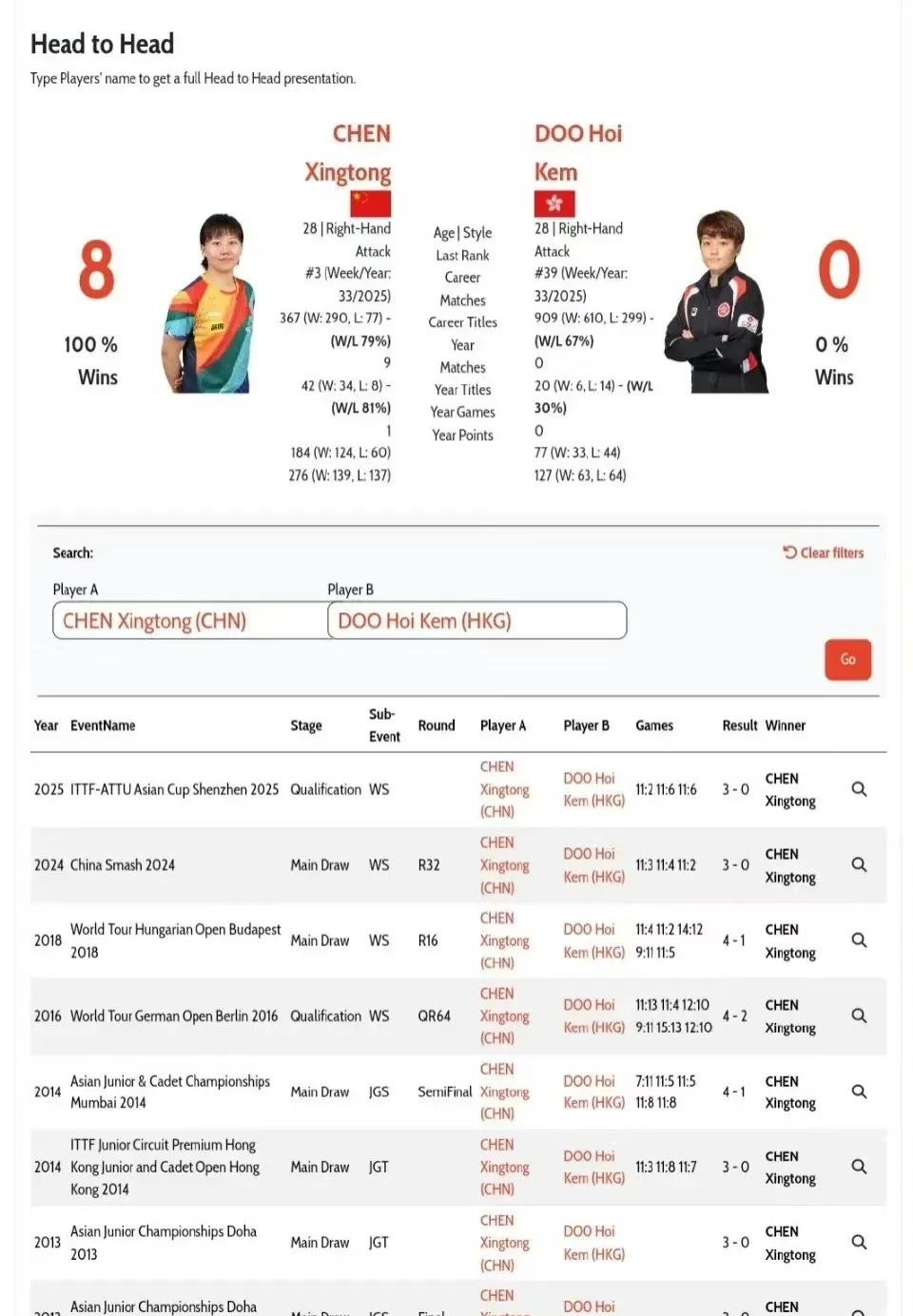 今晚国乒女单的第一场比赛是陈幸同对杜凯琹,比赛在一号台进行,在之前是一场男双的比赛。陈幸同和杜凯琹也算是比较熟悉的对手了,大家私下里关系也不错,看了一下俩人之前的交手记录,已经有过8次交手了,陈幸同是取得8连胜。