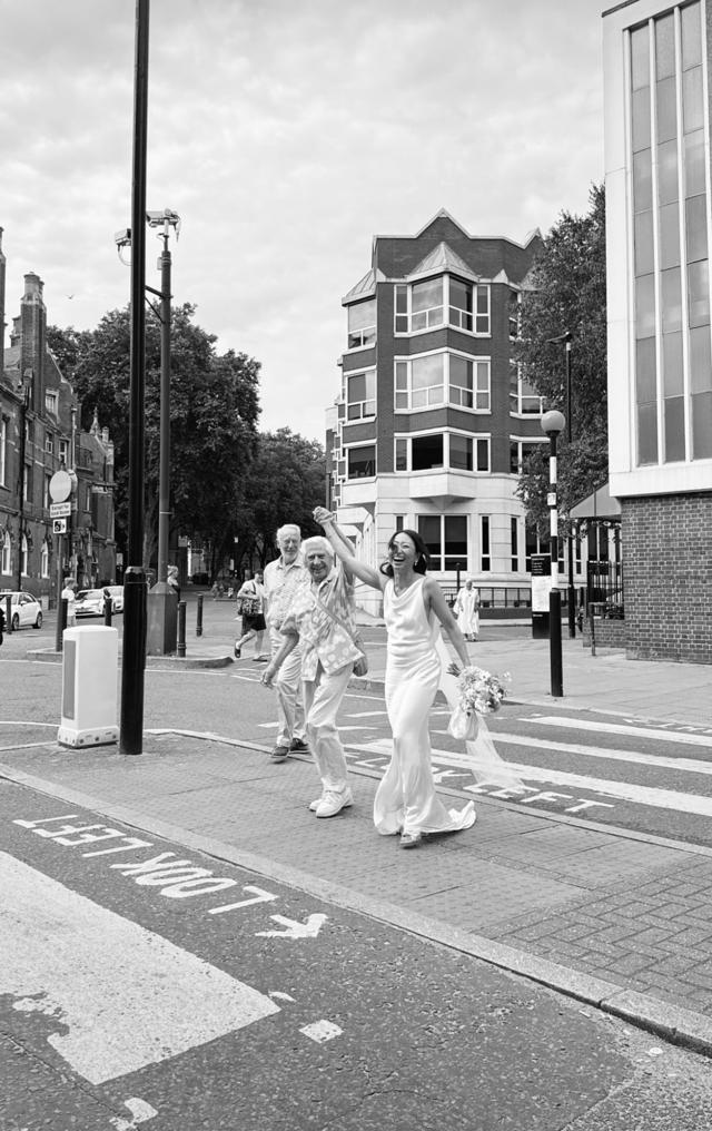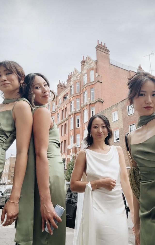 苗彤在街头拍摄婚纱照,随性、自然,有很多抓拍的场景,其中一张是与路边老人牵手过马路的时候的抓拍照,她一手拿着鲜花,一手牵着对方的手,笑得好开心。另外还有与姐妹的合照,合照中苗彤的白婚纱与姐妹的绿色伴娘服形成鲜明的对比,她笑得恬淡,一脸的幸福藏都不藏不住,这个阵仗看来也不像是随便拍来玩的,显然主角就是苗彤,被众星捧月。