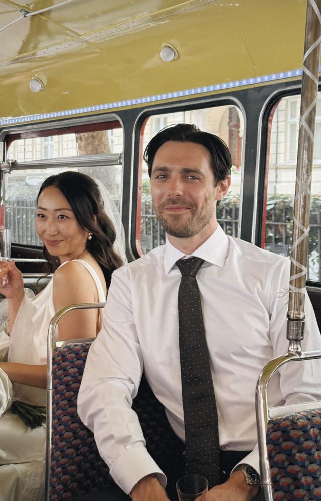 在众多街拍婚纱照中,有一张在巴士上的照片最特别,照片中不只是有苗彤,还有一位打扮正式的男士。这个男士是外国人,留着络腮胡,胡子经过了处理,并不那么邋遢,而他的样子看起来还挺帅气的,看样子也是30多岁的光景。他穿着白色衬衣,打着领带,坐在苗彤前面,特别留意到他与苗彤手上都拿着一个香槟杯,苗彤笑得大方,男士笑得羞涩,两人很合衬,显然就是苗彤的男主角,而这位男士也曾经在苗彤的居家照中出现过。