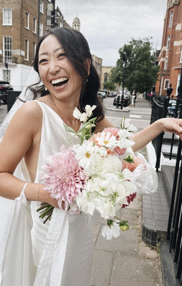 苗彤晒出的这组婚纱照还真不像是摆拍,只见她穿着白色婚纱——婚纱很简约,是一条白色的长裙,搭配了长长的白纱,白纱系在头饰上,一直拖到了地上,显得飘逸、轻盈。这件婚纱看似简约,却很美丽、大方,配合苗彤淡淡的妆容,恰到好处。苗彤手上捧着一束鲜花,留意到她手上戴了两个很细的手链,耳朵戴了耳环,其他就没有过多的修饰,另外无名指上戴了戒指,这个才是关键。