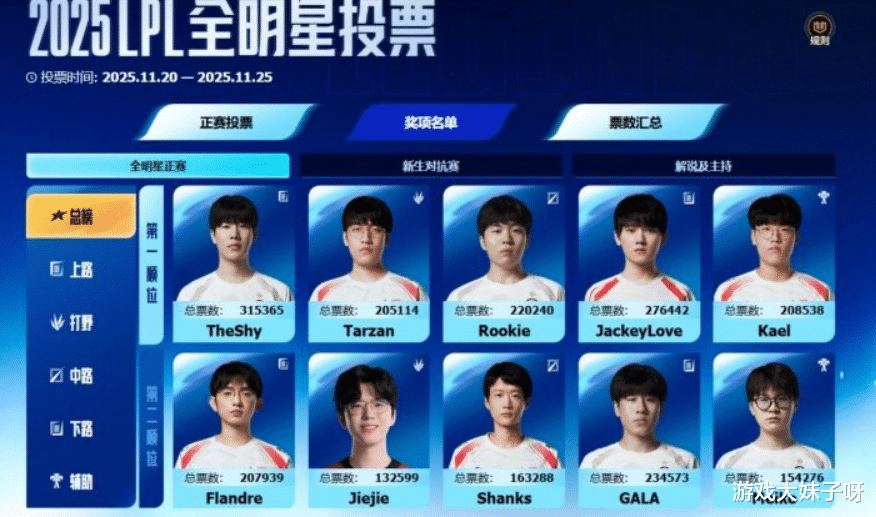 整体来看,今年的全明星投票既是人气大战,也是一次情绪审判,有人靠成绩继续封神,有人靠性格继续被爱,也有人因为一次舞台崩盘,被粉丝按下暂停键,全明星是人气的舞台,但这份人气背后,是LPL粉丝一整年的期待、失望、支持与选择,也正因为如此,今年的榜单才格外耐人寻味,对此你们有什么想说的吗?