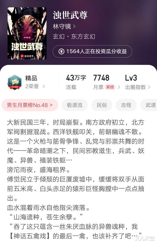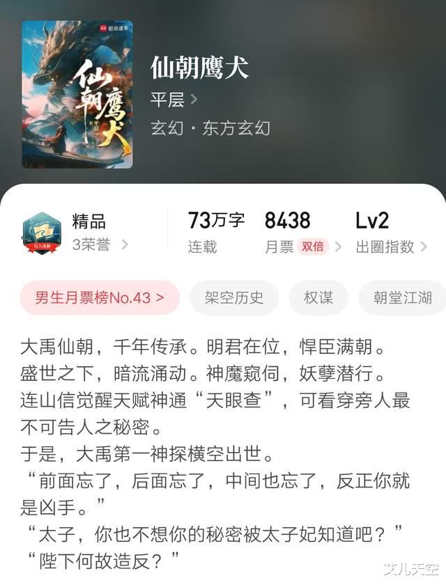 小说上了万订,就是看着后期乏力,从目前的月票榜排名大幅下滑也能窥见一二,后面也不知道能不能稳住。