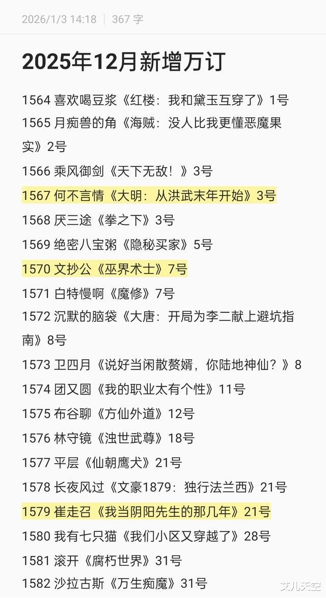 以上就是12月的万订作品情况,2025年结束,全年新增207本万订作品,也不知道大家看了哪些。