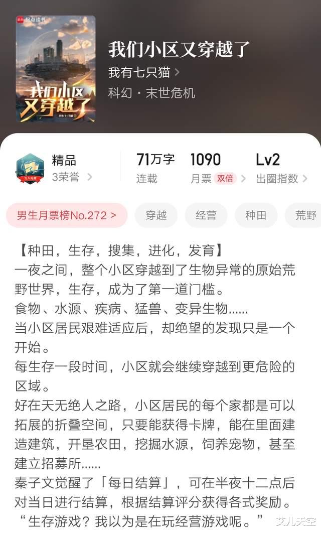 我有七只猫作品,《神宠进化》作者酒池醉马甲。整个小区不断穿越异界,小区里的一众人也不得不开始了各种生存冒险。