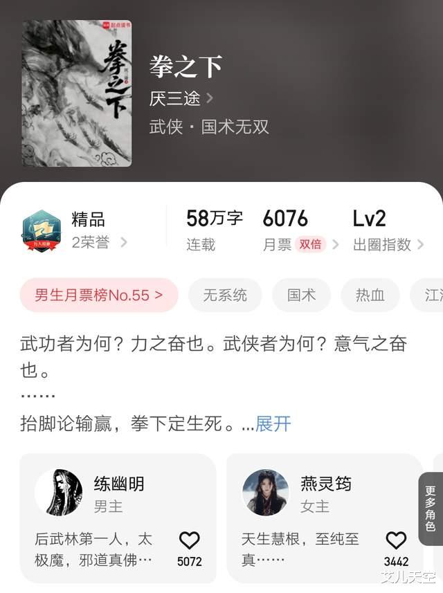 快意恩仇,国术江湖,儿女情长,这本里也都有,目前来看是双女主配置。