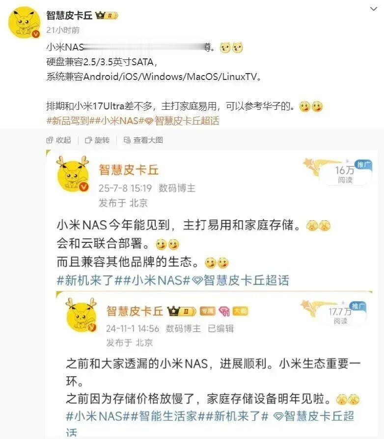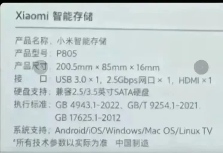 据博主@智慧皮卡丘 爆料,小米 NAS / Xiaomi 智能存储硬盘兼容 2.5/3.5 英寸 SATA,系统兼容 Android / iOS / Windows / MacOS / LinuxTV。排期和小米 17 Ultra 差不多,主打家庭易用。