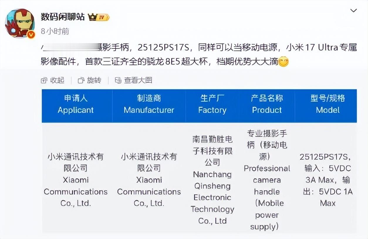 近日,一款一款型号为25125PS17S小米新品于11月19日通过了工信部3C认证,有博主透露该产品为小米新款专业摄影手柄,同样可以当移动电源,小米17 Ultra专属影像配件,首款三证齐全的第五代骁龙8至尊版超大杯。