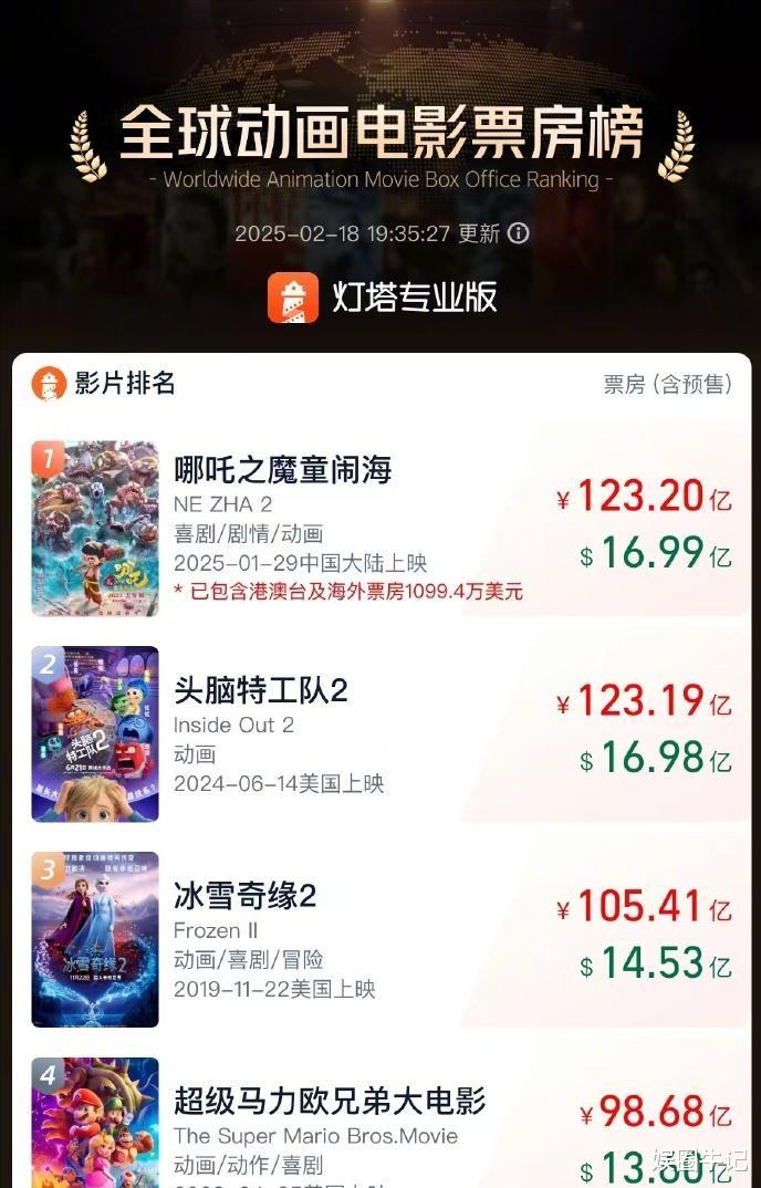 《哪吒2》全球票房破纪录,直接把《头脑特工队2》给按在地上摩擦了!这可是实打实的全球动画电影票房冠军啊!