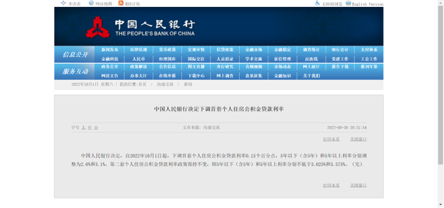 第一,根据中国人民银行2022-09-30 20:31:54发文,决定下调首套个人住房公积金贷款利率: