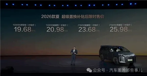 近两月以来,比亚迪王朝主力轿车、SUV车型均完成了“上新”,产品力大大提升。11 月 4 日,2026 款比亚迪夏正式上市,共推出4款车型,售价区间为20.68-26.98万元,超级置换补贴后限时售价19.68-25.98万元。新车的核心变化点是 CLTC 纯电续航里程从 180km 提升到 218km。这一数据让它在插混MPV市场中竞争力大增。同时,新车搭载天神之眼B辅助驾驶,还有带预瞄系统的云辇C、智能底盘-TBC高速爆胎稳行系统、智能座舱高阶版DiLink150等配置。按之前车型的推新策略来看,2026款夏极大可能是加配不加价,30万级有望拿下顶配。
