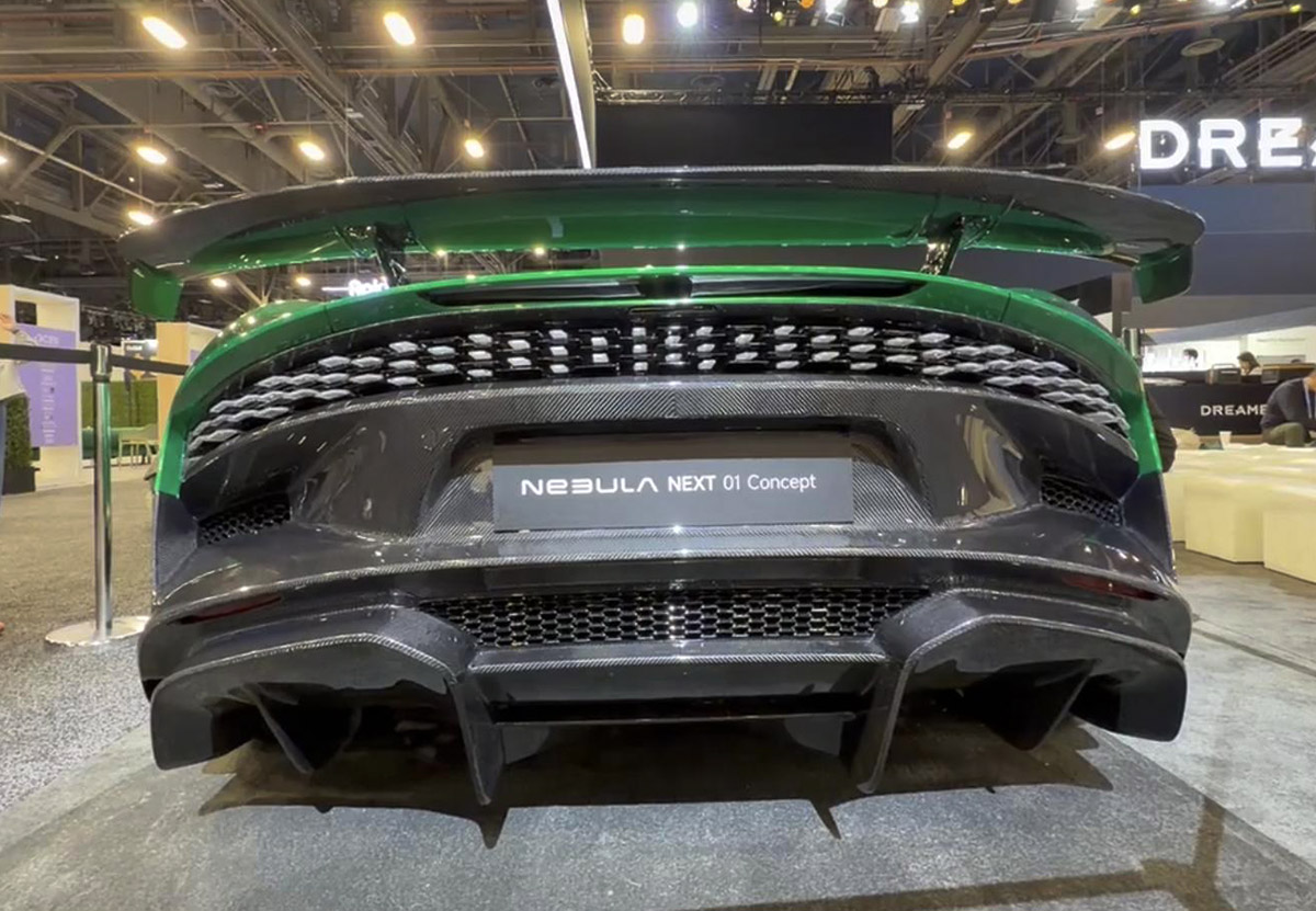 车尾提供了碳纤维大尾翼,尾灯造型很抢眼,使用了片状的发光片组成的横贯式结构,尾灯以下的部分都是碳纤维纹理,底部是赛车式的扰流设计。