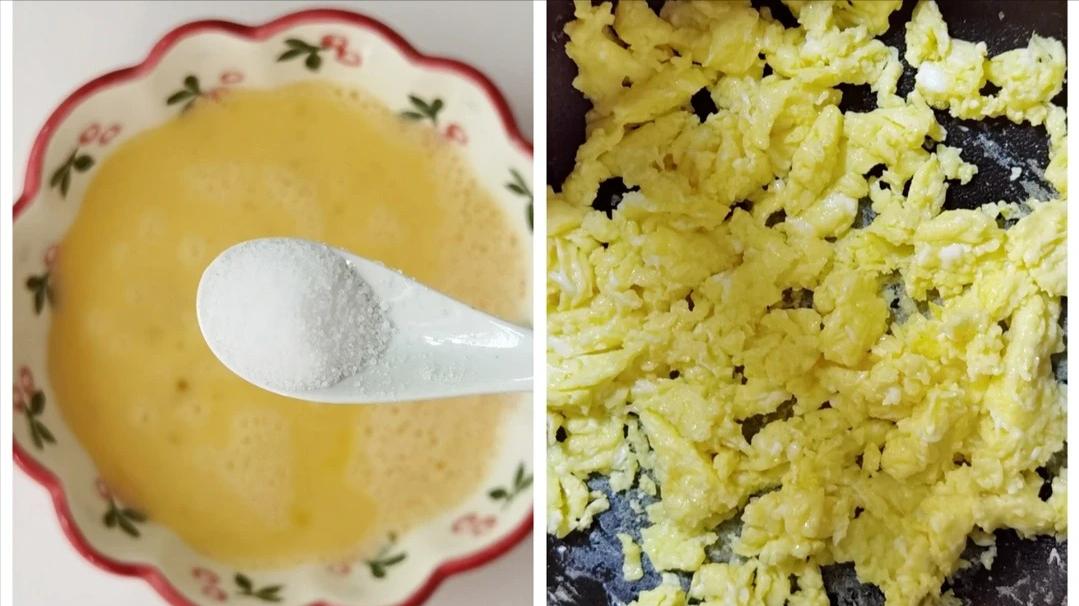 3、把 3 个鸡蛋打散,加一点点盐调味。锅里放油烧热,把蛋液倒进去快速炒散,盛出来放凉。30 克虾皮,最好用清水泡一下,洗去多余的盐和灰尘,挤干后,用点油小火炒香,这样鲜味更足。