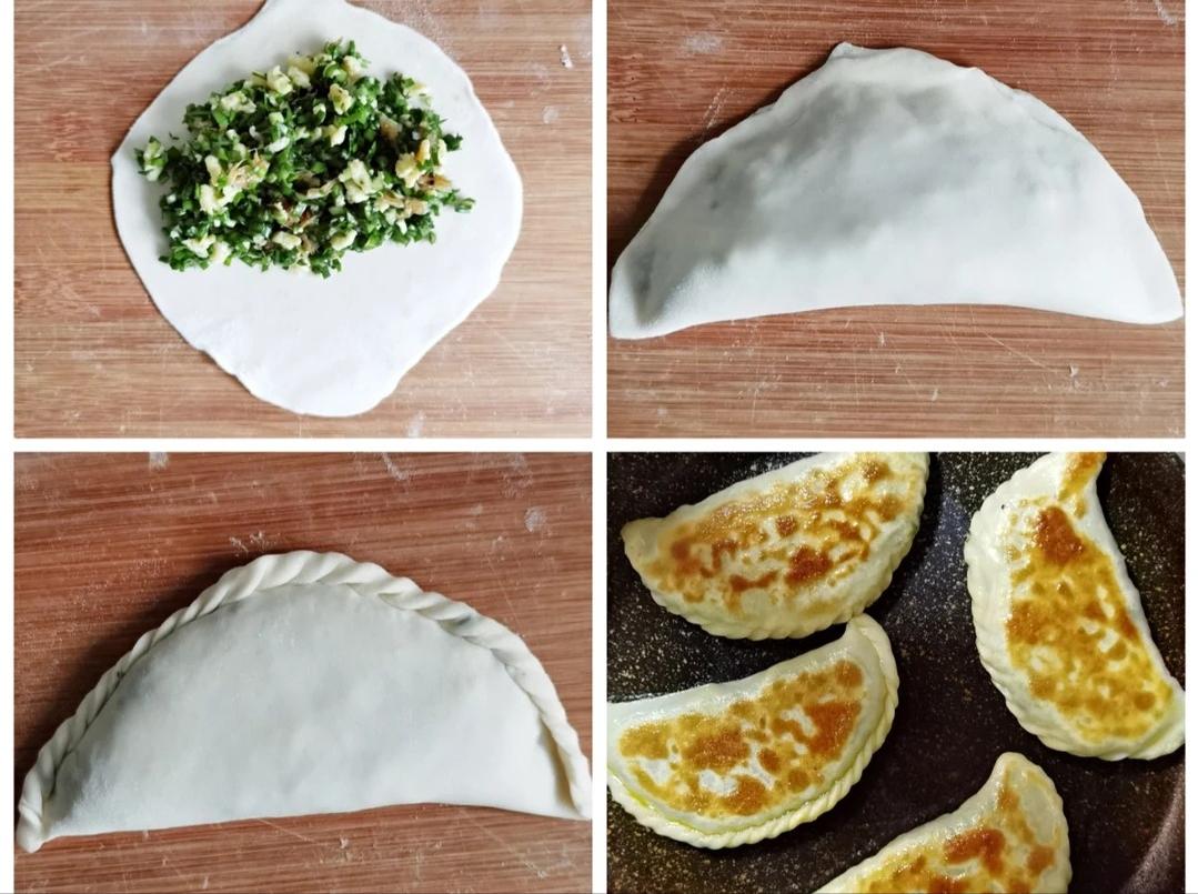 5、把松弛好的面团分成一个个小剂子,擀成中间厚、边缘薄的圆皮。多放点馅料,对折后把边捏紧,还能折出花褶,好看又不容易露馅。