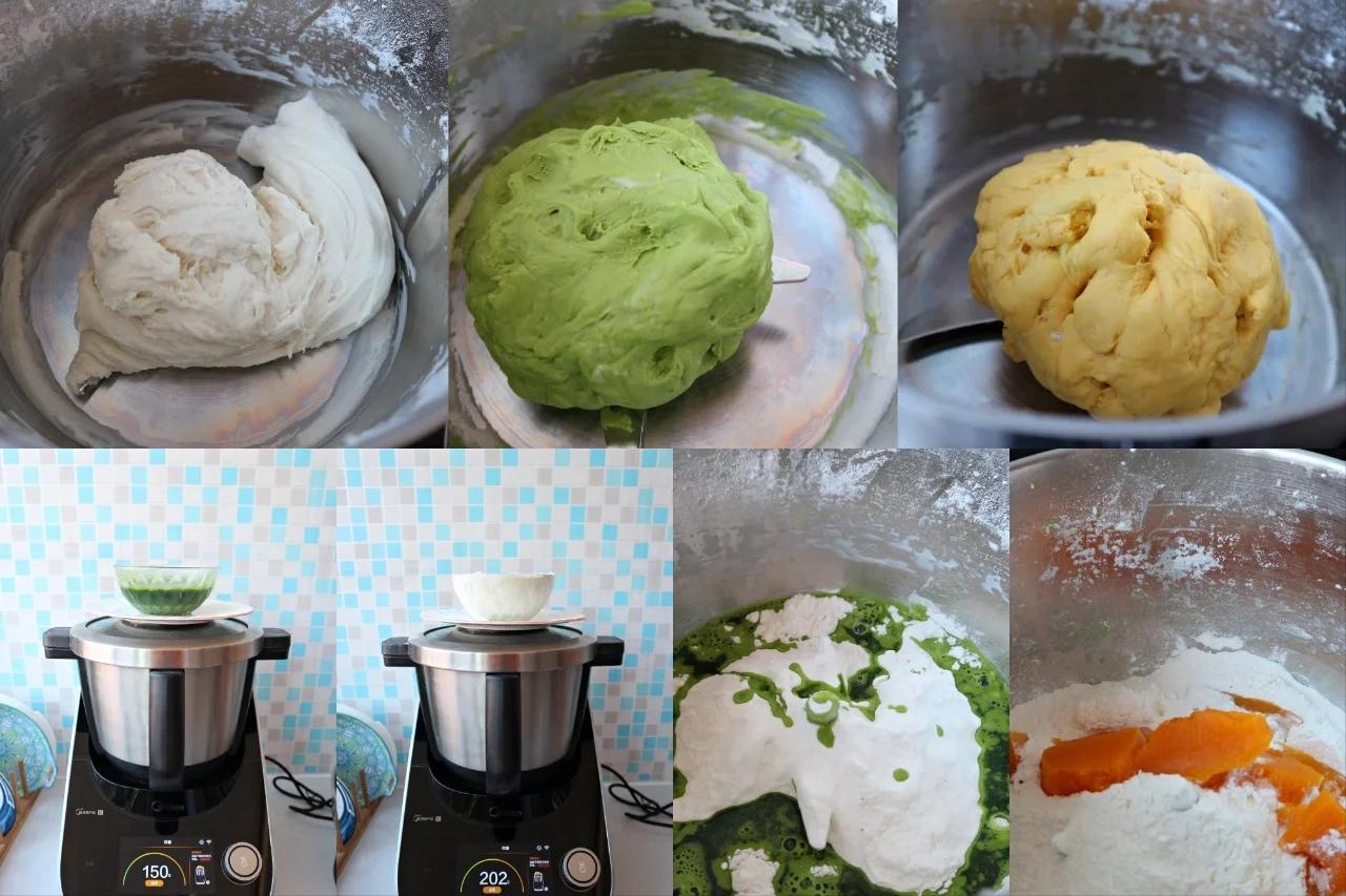 食材:面粉600克、菠菜一把、南瓜一块、里脊肉150克、土豆一个、胡萝卜半个,豆芽一盘、韭菜一把、酱油15克、蚝油15克、盐2克、植物油50克