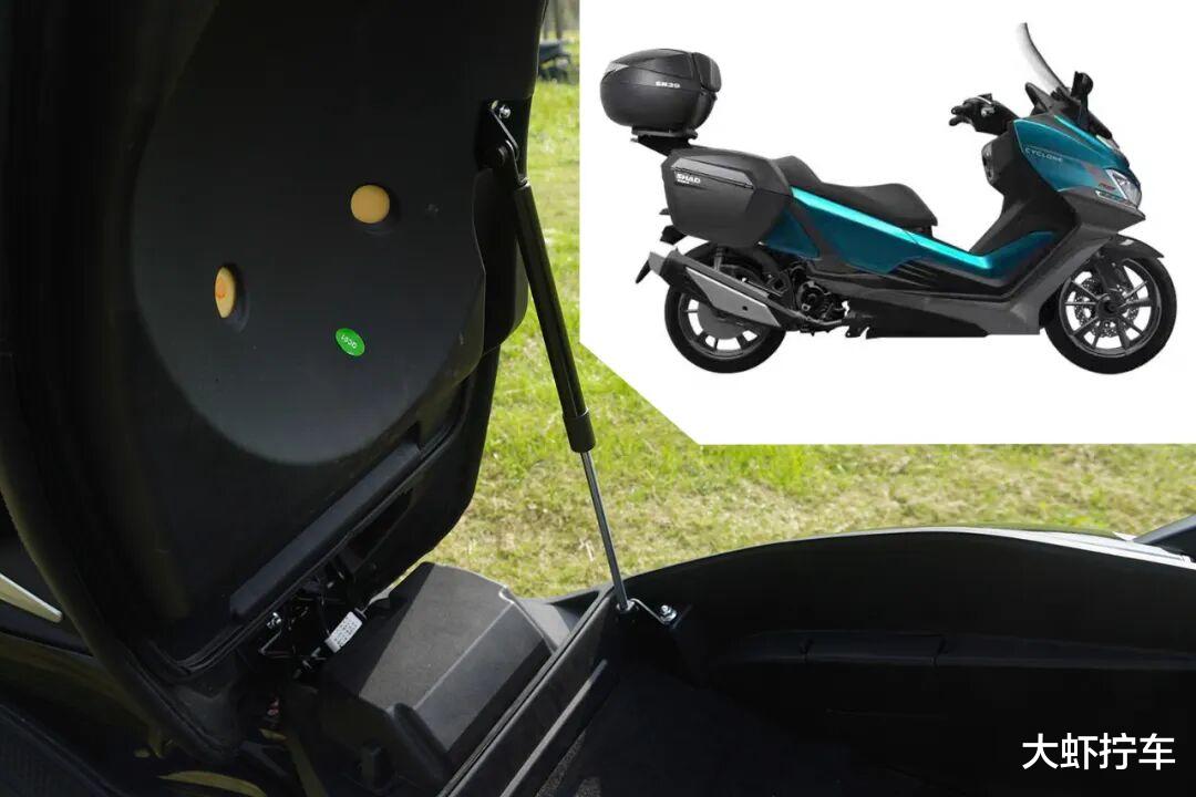 储物仓内部带有照明灯和气压撑杆。由于油箱容积和上置发动机吊架的设计影响,RT5的座下储物仓在中大型踏板车款中称不上顶尖,不过赛科龙为RT3/RT5提供了原厂适配夏德边箱的3P支架选装配件,它也是少数在安装边箱后不影响颜值和车身线条的车型。如果把边箱的容积算上,相信不会有人认为RT5的储物空间不够用了吧。