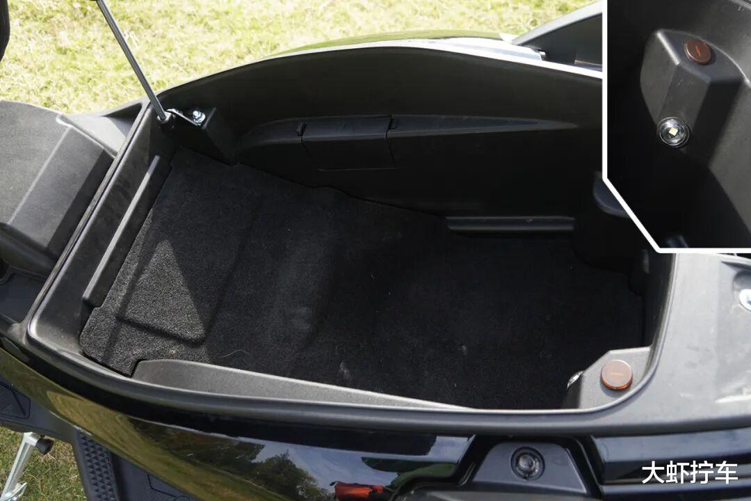 RT5座下储物仓长56宽36深20cm,开口规整但深度稍显不足。座垫中后部向上掏空为放置头盔留出了空间,所以能够放下一顶造型不太夸张的全盔再加上一些雨衣等杂物,普通的双肩包视厚度情况也能容纳。