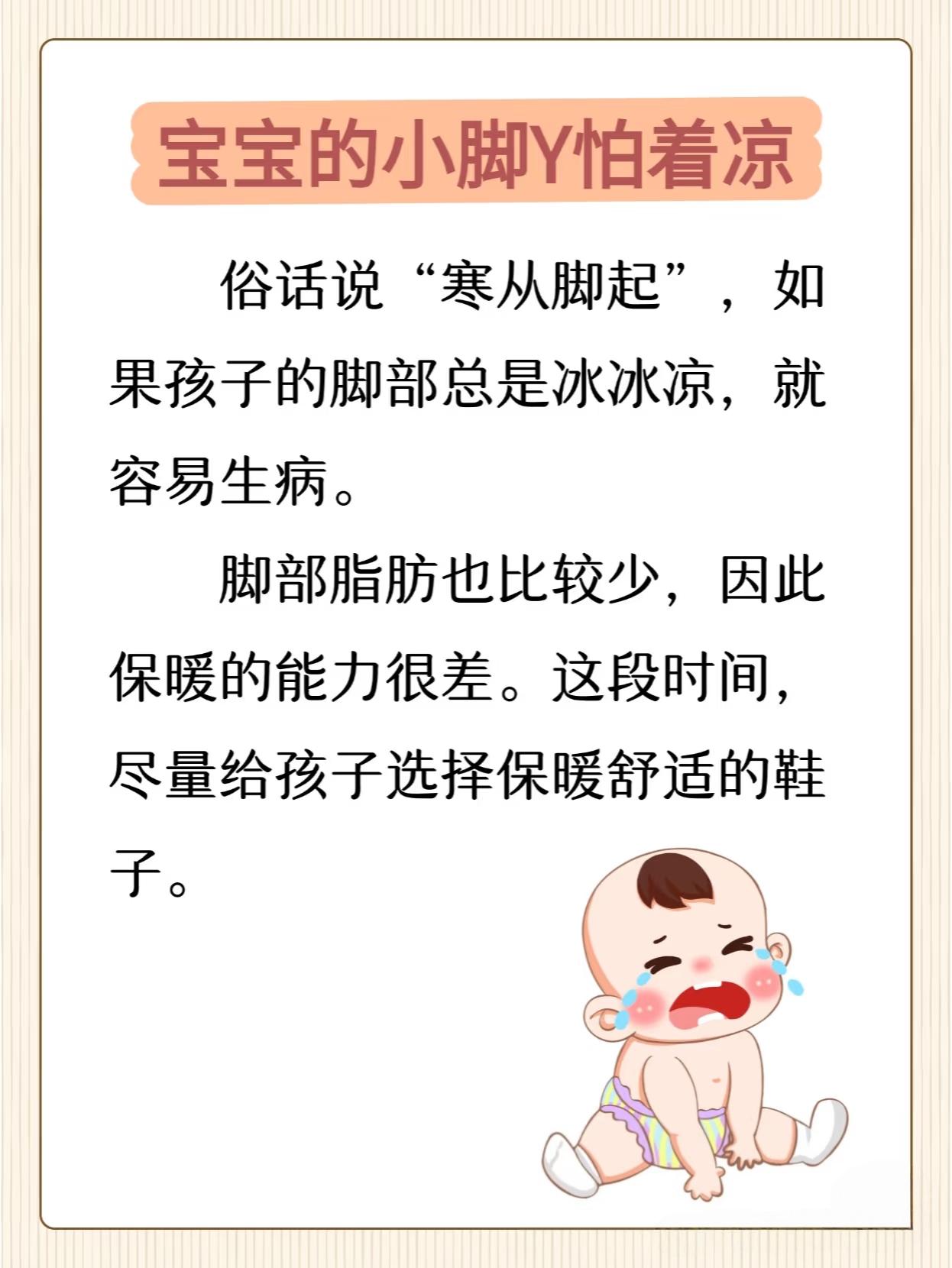 宝宝的小脚丫布满了神经末梢,对温度变化格外敏感。俗话说“寒从脚起”,一旦脚部受凉,全身的血液循环都会受到影响,抵抗力自然会下降。