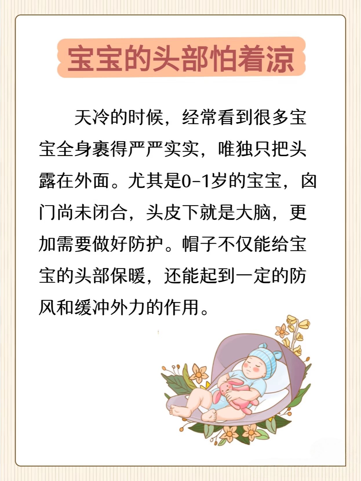 婴幼儿头部表面积相对较大,而且血管丰富,约30%的身体热量会从头部散失。在低温环境下,头部保暖尤为重要。
