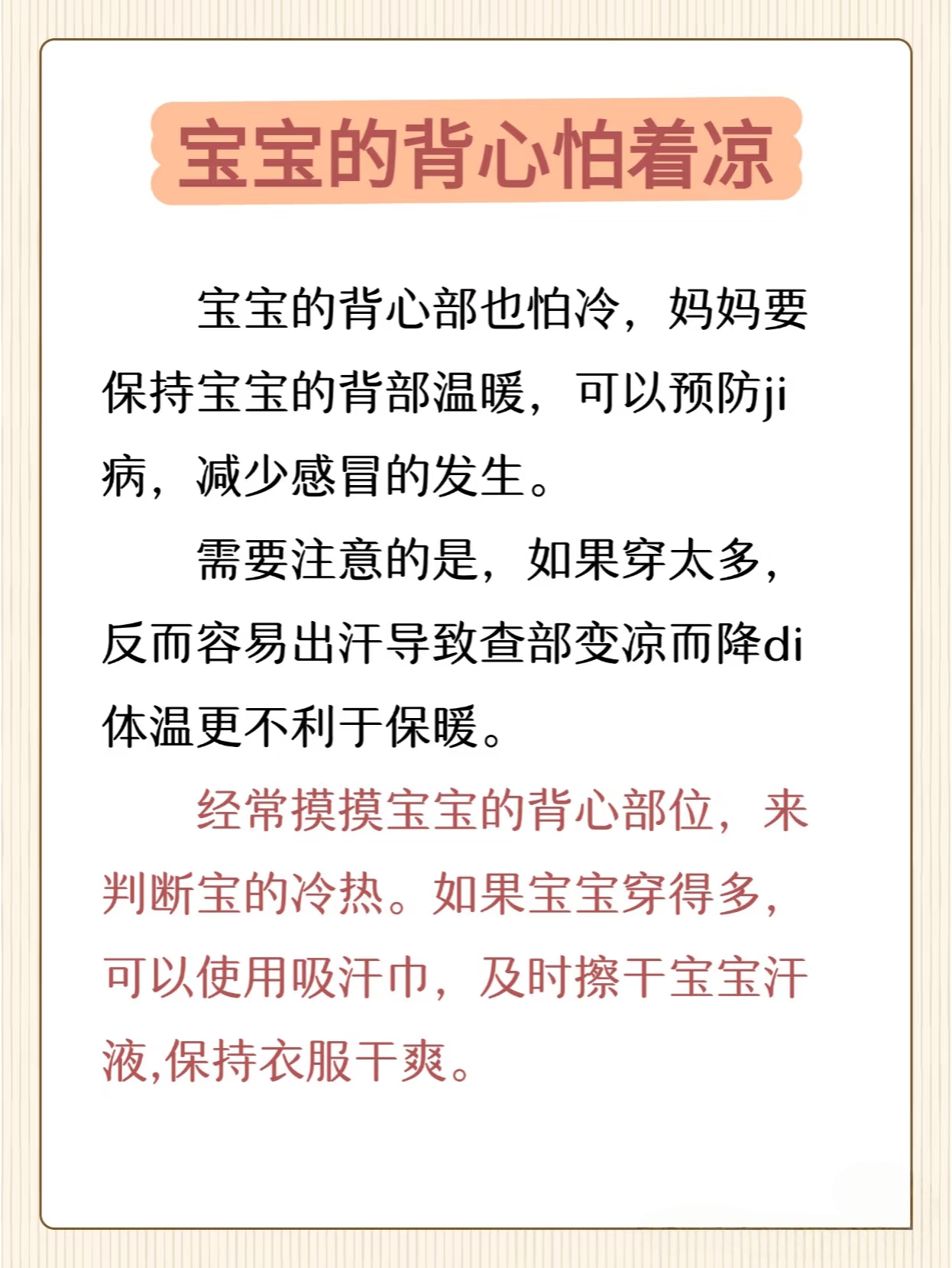 后背是判断宝宝冷暖的绝佳位置。摸起来温热干燥说明穿衣合适;如果出汗了,说明穿得过多,汗液蒸发时反而更容易感冒。