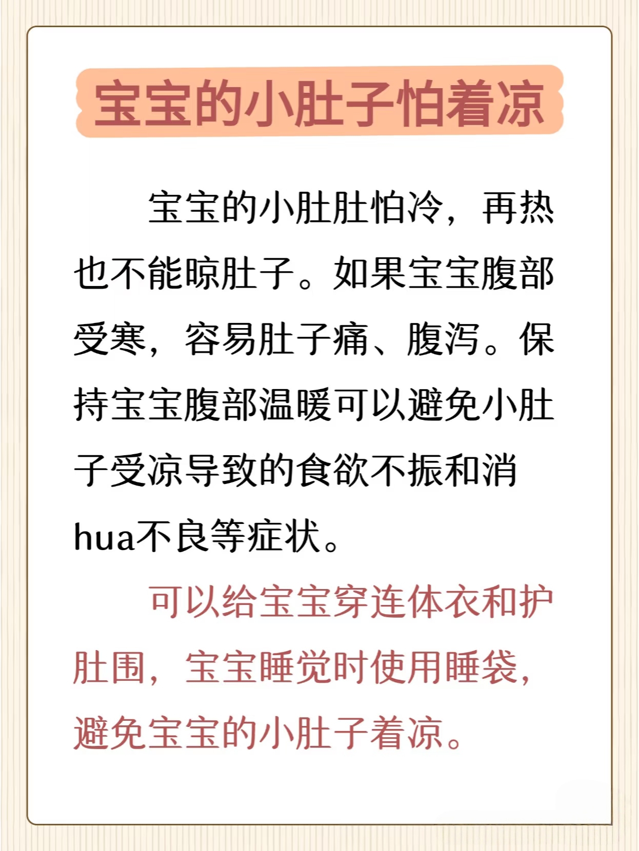 宝宝的腹部一旦受凉,容易导致脾胃功能紊乱,出现腹泻、消化不良、食欲不振等问题。保护好小肚子,就是守护了宝宝的营养吸收通道。