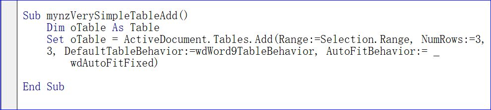 Set oTable = ActiveDocument.Tables.Add(Range:=Selection.Range, NumRows:=3, NumColumns:= _