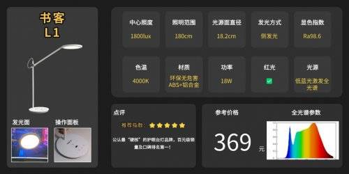 书客L1还获得6家全球权威检测认证,达到Ra98高显色、无频闪、抑制眩光、RG0豁免级无蓝光的要求,具备45分钟定时休息、夜灯模式、手扫无极调光多个提升使用体验的功能。更运用OCLT光透镜设计出360度交替照明的光路,消减手部阴影,并且182CM²的大面积光源,打造出2米全桌面的自然光,让用眼更舒服