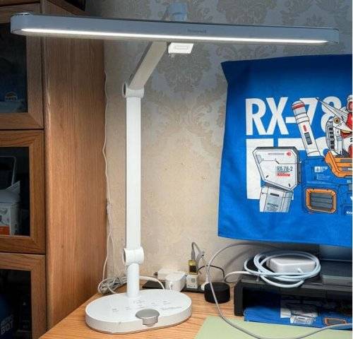 照明方面,该台灯配备了一条长约50厘米的条形光源,采用直射式发光设计,能够有效覆盖约1.2米的工作区域,充分满足多本书同时摆放或多人共用时的照明需求。光线分布均匀,表现较为出色,但由于直发光结构的特点,如果灯头角度调整不当,直视光源时可能会感受到一定的眩光,建议合理调整灯头位置以提高使用时的视觉舒适度。