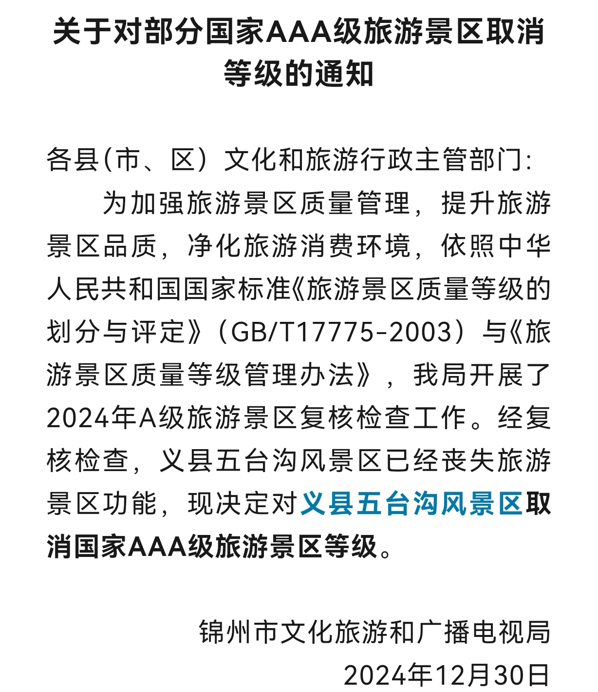 近日,锦州市文化旅游和广播电视局发布了《关于对部分国家AAA级旅游景区取消等级的通知》,通知指出,为加强旅游景区质量管理,提升旅游景区品质,净化旅游消费环境,依照相关法规,经复核检查,义县五台沟风景区已经丧失旅游景区功能,现决定对义县五台沟风景区取消国家AAA级旅游景区等级。