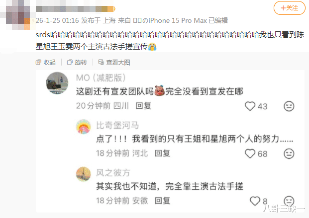 网友难得一边倒,都在帮王玉雯说话,有嫌弃这部剧宣发太差,出圈全靠主演努力的。(更何况两位主演熟人局,陈星旭拍抽象剧宣容易i人属性大爆发,放不开的时候全靠王姐带动气氛)